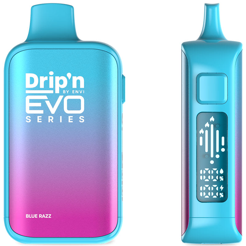 The Blue Razz flavour Drip'n EVO 63K Disposable Vape by Envi delivers up to 63000 puffs of vapor with 20mL of e-liquid, an 850mAh rechargeable battery, dual mesh coils, adjustable airflow control, and multiple firing modes.