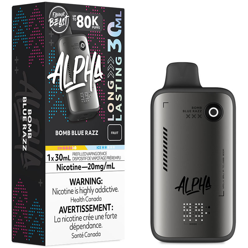 The Bomb Blue Razz flavour Alpha 80K Disposable Vape by Flavour Beast delivers up to 80000 puffs of vapor with 30mL of e-liquid, an 850mAh rechargeable battery, dual mesh coils, and multiple firing modes.