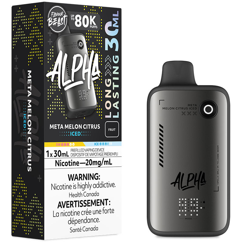 The Meta Melon Citrus Iced flavour Alpha 80K Disposable Vape by Flavour Beast delivers up to 80000 puffs of vapor with 30mL of e-liquid, an 850mAh rechargeable battery, dual mesh coils, and multiple firing modes.