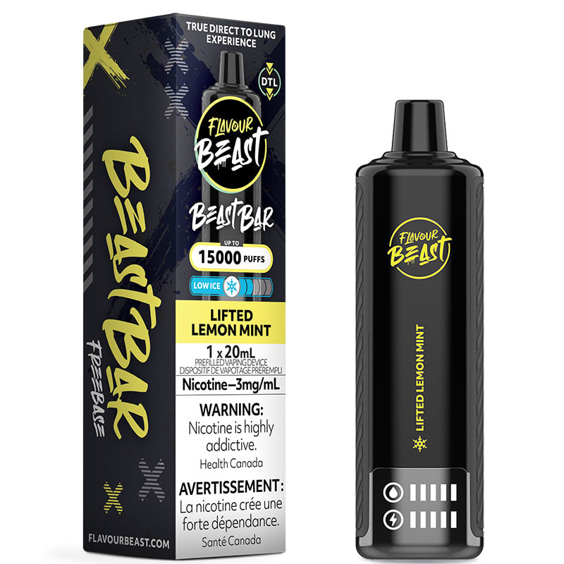 The Lifted Lemon Mint Low Ice flavour Beast Bar 15K Disposable Vape by Flavour Beast is a direct to lung device that delivers up to 15000 puffs of vapor using 20mL of e-liquid with 3mg/mL of freebase nicotine, an 1100mAh rechargeable battery, adjustable airflow, and an LED screen.