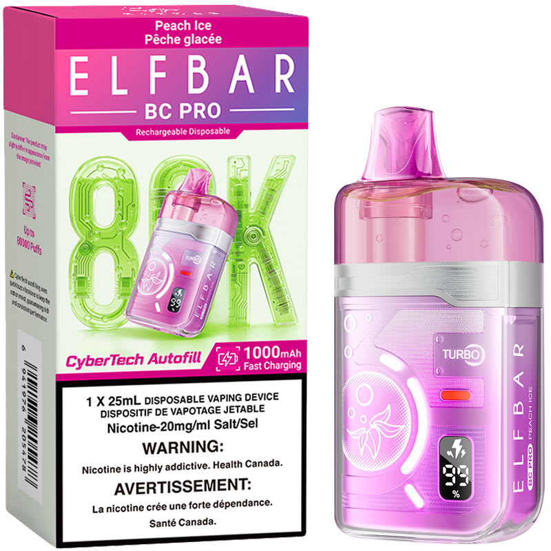 La saveur Peach Ice BC Pro 80K Disposable Vape de Elfbar offre jusqu'à 80000 bouffées de vapeur avec 25 ml d'e-liquide, une batterie rechargeable de 1000 mAh, double résistance mesh, Contrôle du flux d'air réglable, et Plusieurs modes de tir.