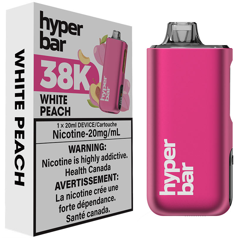 La vape jetable Hyperbar BE38000 saveur Pêche Blanche délivre jusqu'à 38 000 bouffées de vapeur avec 20 ml d'e-liquide et une batterie rechargeable de 900 mAh, un écran LED, une fenêtre d'e-liquide visible, plusieurs modes de tir et un flux d'air réglable.