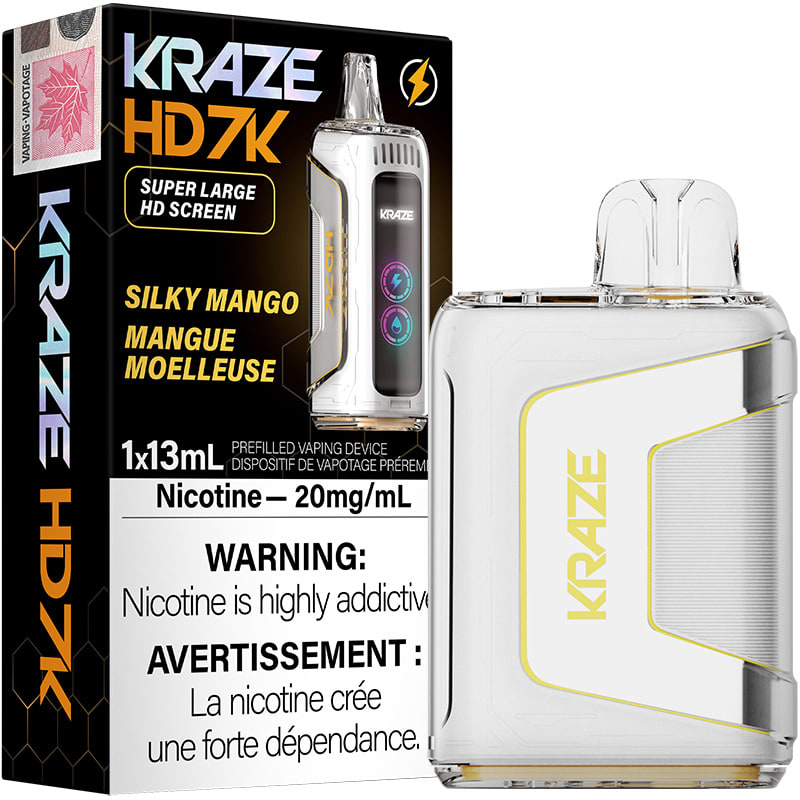 La saveur mangue soyeuse La vape jetable Kraze HD 7K délivre jusqu'à 7000 bouffées de vapeur avec un flux d'air réglable en utilisant 13 mld'e-liquide aux sels de nicotine et une résistance en mesh alimentée par une batterie rechargeable 650 mAh, avec un grand écran TFT qui affiche clairement la charge de la batterie et les niveaux d'e-liquide.