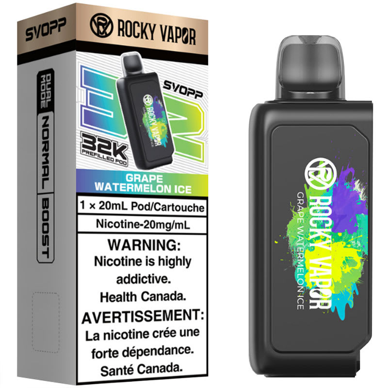 Le pod SVOPP 32K saveur Raisin Pastèque Glacée de Rocky Vapor délivre jusqu'à 32 000 bouffées de vapeur en utilisant 20 ml d'e-liquide prérempli, lorsqu'il est associé à une batterie SVOPP (requise).