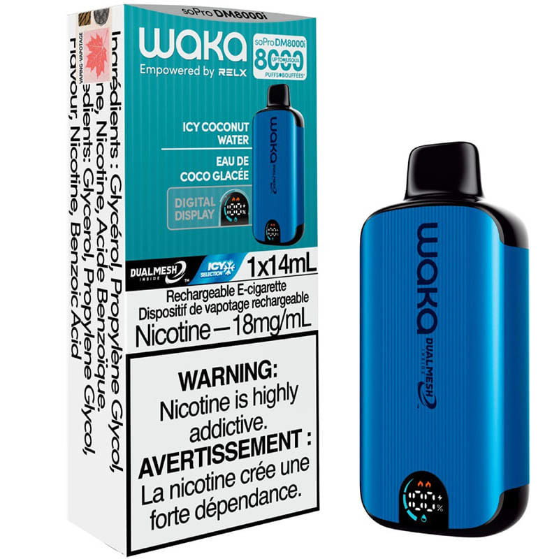 La saveur Eau de coco glacée La vape jetable Waka soPro DM8000i délivre jusqu'à 8000 bouffées de vapeur délicieuse en utilisant 14 ml d'e-liquide prérempli et une Batterie rechargeable de 850 mAh, avec un mode boost pour doubler la production de vapeur et un écran LED affichant les niveaux de charge et d'e-liquide.