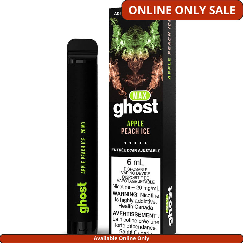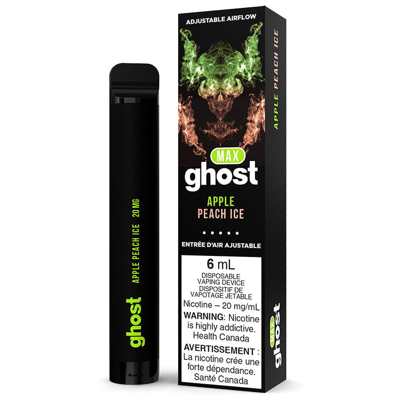 This Apple Peach Ice Ghost Max Disposable Vape Pen is prefilled with 6mL of cool fruity e-liquid with 20mg/mL of nic salts or Bold50 hybrid nicotine, and the 1050mAh battery delivers up to 2000 puffs of flavourful vapor with a 1.3Ω coil and adjustable airflow control.