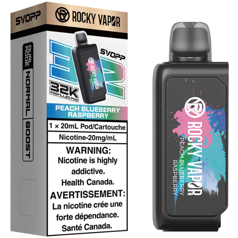 The Peach Blueberry Raspberry flavour SVOPP 32K Pod from Rocky Vapor delivers up to 32000 puffs of vapor using 20mL of prefilled e-liquid, when paired with an SVOPP battery (required).