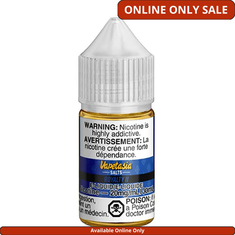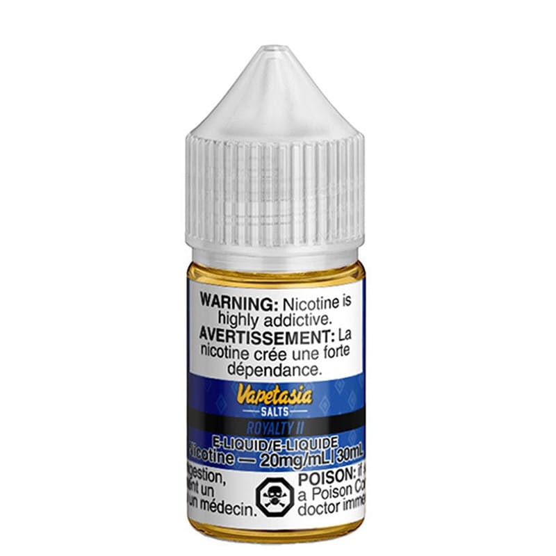 (Read more)Royalty II Salts by Vapetasia mixes smooth custard, sweet hazelnuts, and creamy vanilla with mild tobacco, creating a bold nicotine salt¹ e-liquid that truly is fit for a King or Queen. A dessert flavoured tobacco, crafted for the upper crust.