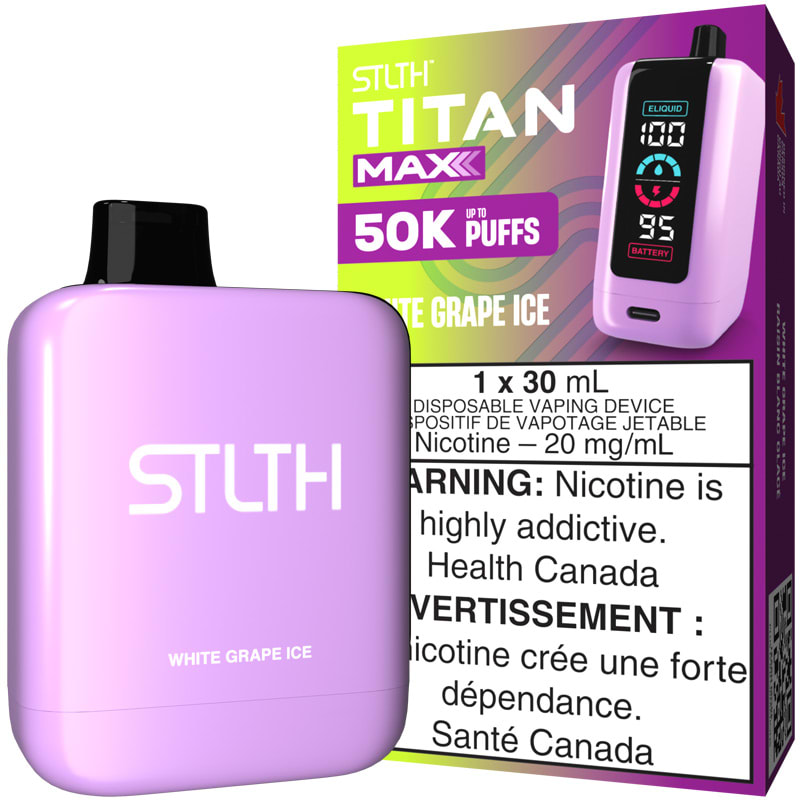 The White Grape Ice flavour STLTH Titan Max disposable vape delivers up to 50000 puffs of vapor using 30mL of e-liquid and a quad coil powered by a 1000mAh rechargeable battery, with adjustable airflow and an LED screen displaying the e-liquid volume and charge level.
