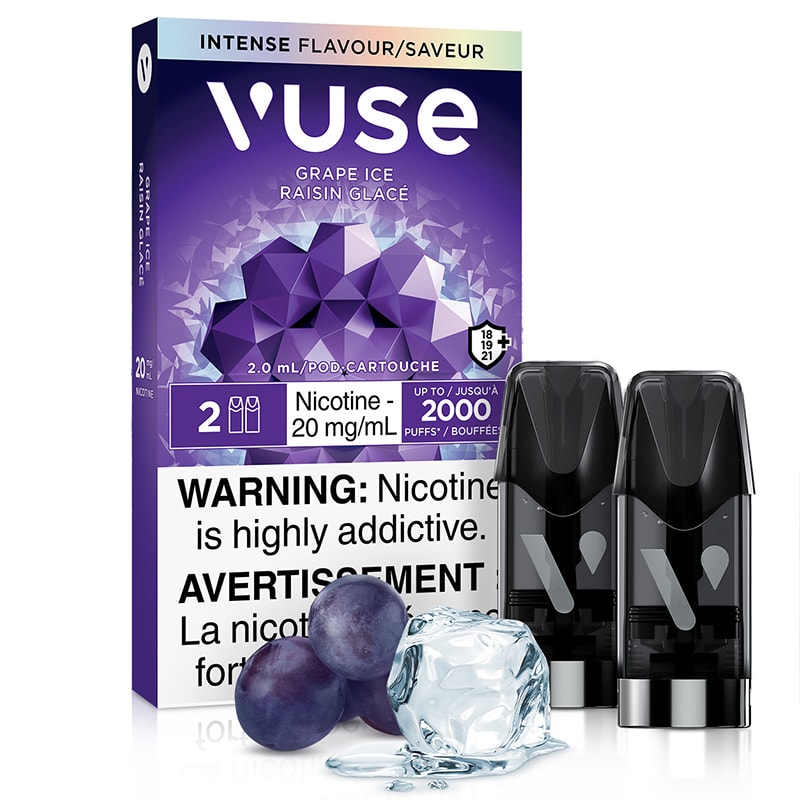 A pack of 2 Grape Ice Vuse Pods, in a dark and intense purple grape flavour with an icy cool twist.
