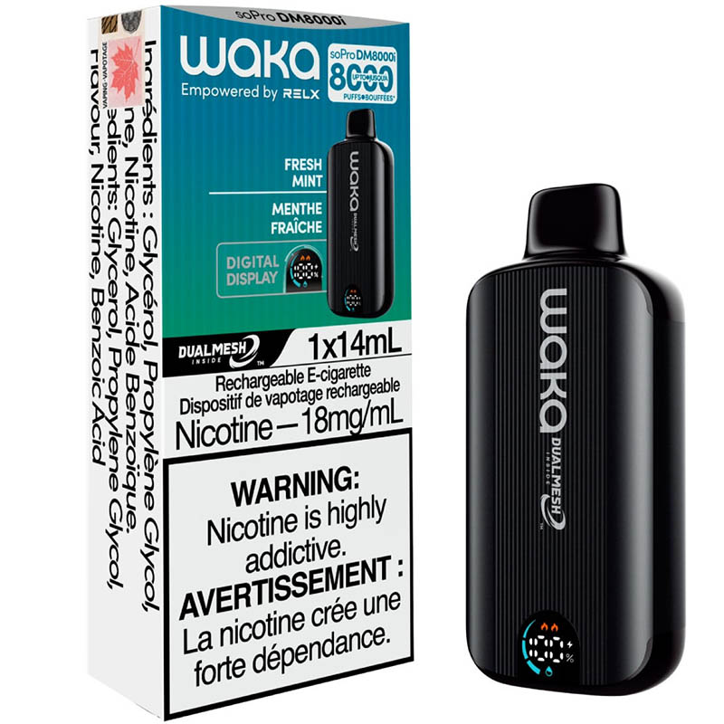 The Fresh Mint flavour Waka soPro DM8000i disposable vape delivers up to 8000 puffs of delicious vapor using 14mL of prefilled e-liquid and a 850mAh rechargeable battery, with boost mode to double the vapor output, and an LED screen displaying the charge and e-liquid levels.