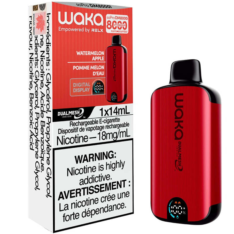 The Watermelon Apple flavour Waka soPro DM8000i disposable vape delivers up to 8000 puffs of delicious vapor using 14mL of prefilled e-liquid and a 850mAh rechargeable battery, with boost mode to double the vapor output, and an LED screen displaying the charge and e-liquid levels.